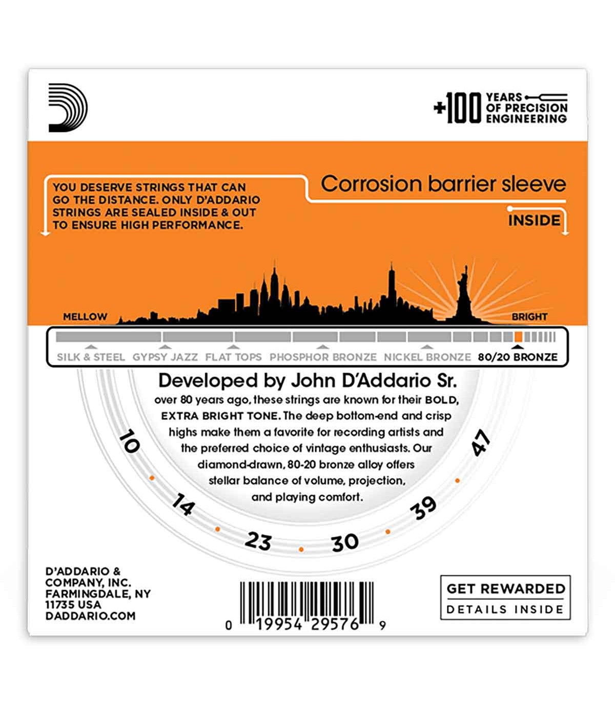 Las cuerdas D’Addario 80/20 de bronce para guitarra acústica ofrecen un sonido brillante y potente, con ricos armónicos y una excelente proyección. Desarrolladas por John D’Addario Sr. y el luthier John D’Angelico en la década de 1930, siguen siendo apreciadas por su tono brillante. Fabricadas con un núcleo hexagonal de acero al carbono y un entorchado de bronce 80/20, proporcionan una profundidad y un brillo excepcionales. El calibre 10-47 Extra Light facilita la ejecución y los bends. Hechas en EE. UU. Este paquete incluye 3 juegos.