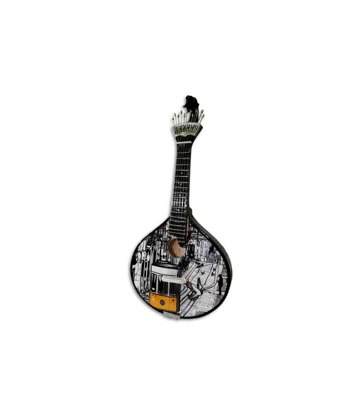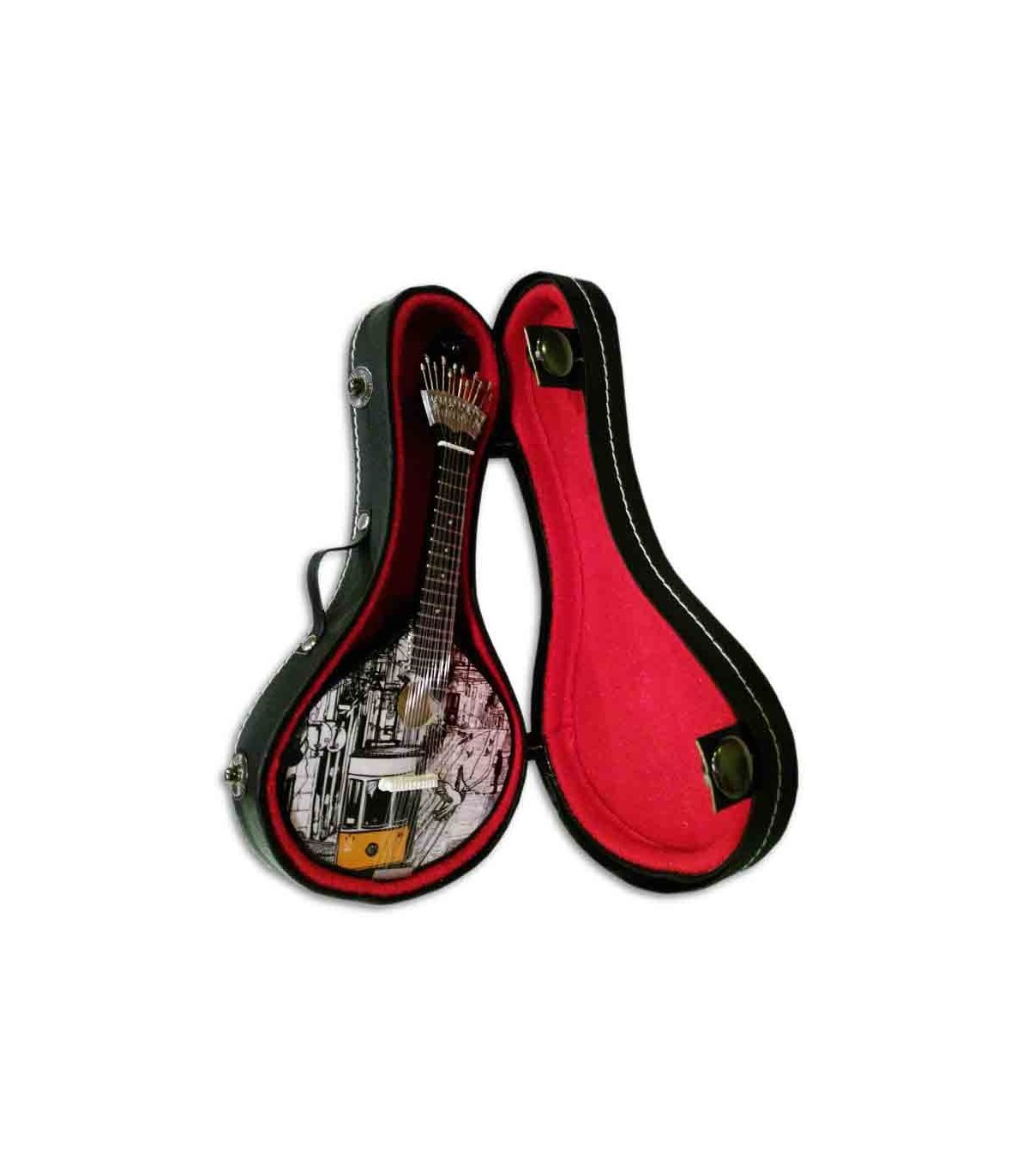 Esta miniatura Artcarmo 547 representa una guitarra portuguesa de Lisboa. La parte superior está decorada con un tranvía típico de Lisboa sobre un diseño gris. Con estuche y soporte.