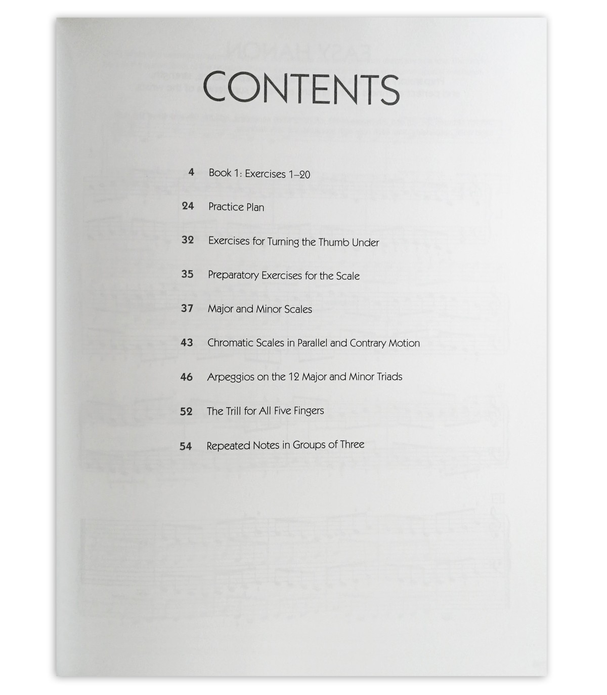 Incluye: ejercicios 1-20; ejercicios de pulgar hacia abajo; ejercicios preparatorios para la escala; escalas mayores y menores; escalas cromáticas; arpegios; plan de práctica.