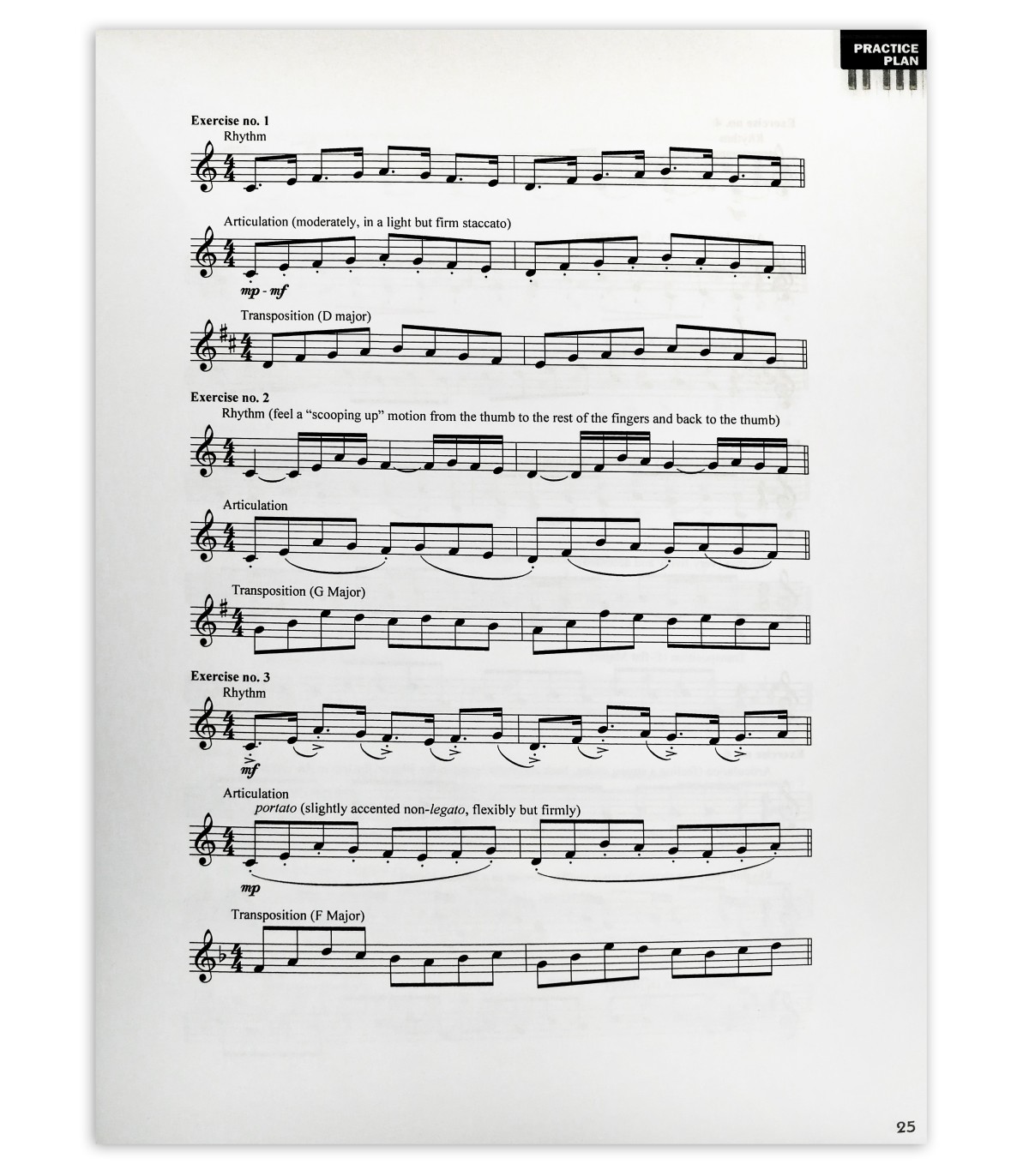 Un plan de práctica adicional creado por el editor incluye variaciones rítmicas y de articulación sugeridas para los ejercicios.