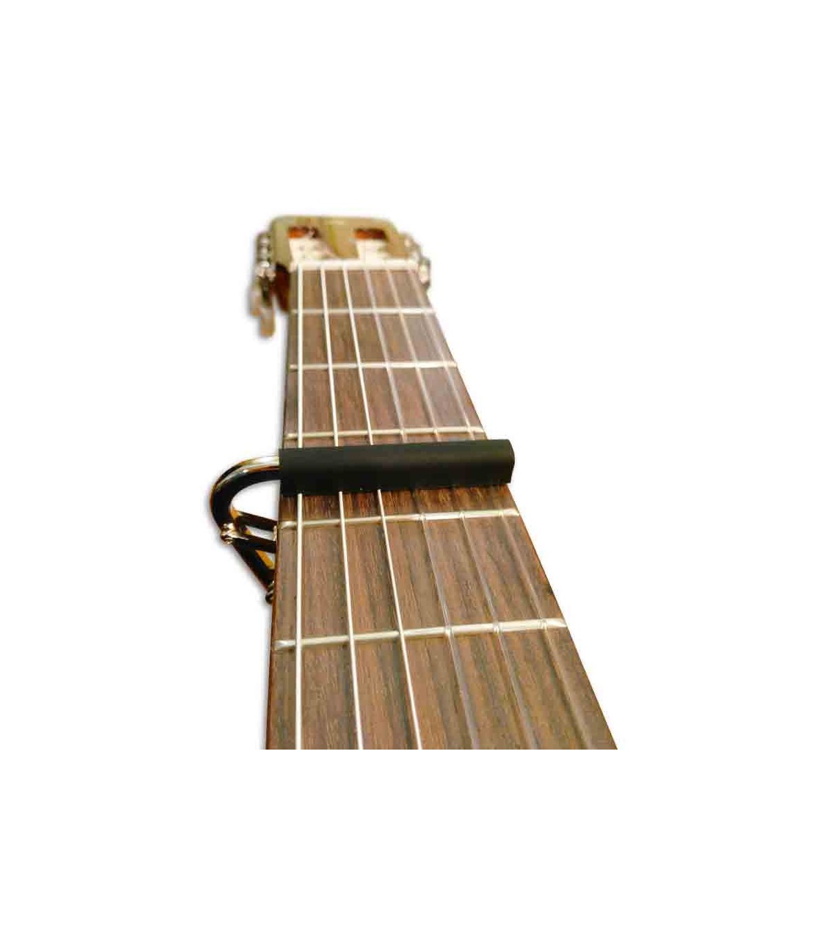 The capo Shubb C2 is one of the best capos for classical guitar on the market. It is designed to fit well to the guitar neck in order to maintain the pitch. The soft, sturdy rubber was specially designed to act like a finger bar. It is quite thin and discreet, very easy and quick to put or move on the guitar neck.