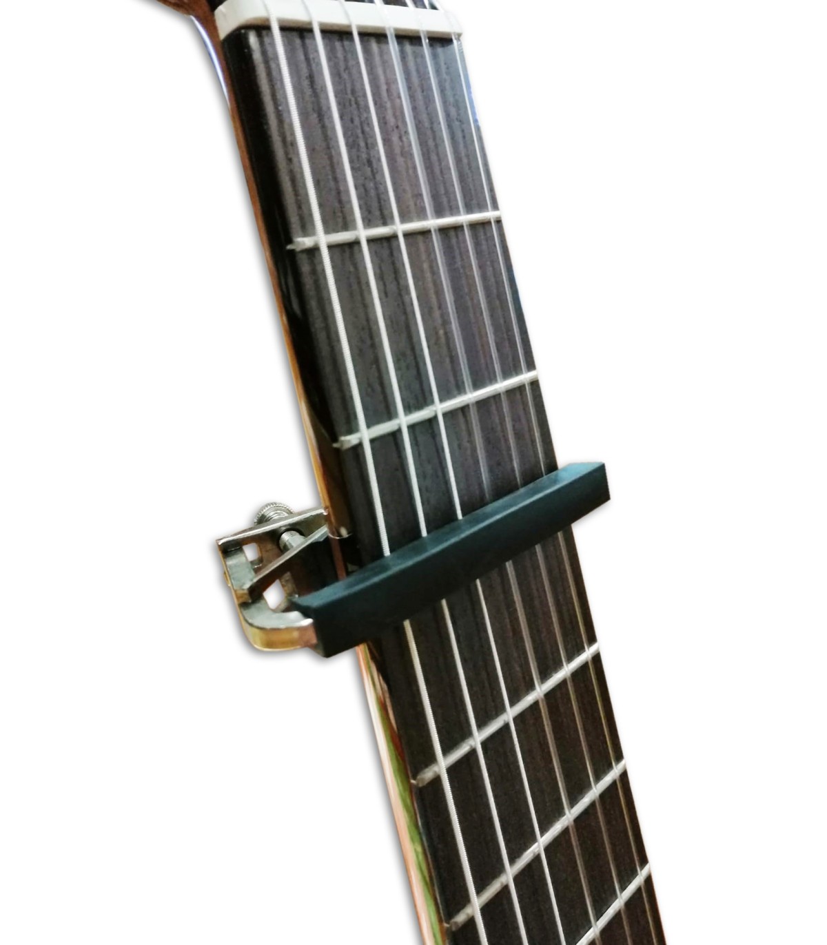 This capo is a discreet, useful guitar accessory. Made of nickel plated steel, the rubber part simulates the pressure applied by a bar made with your fingers.