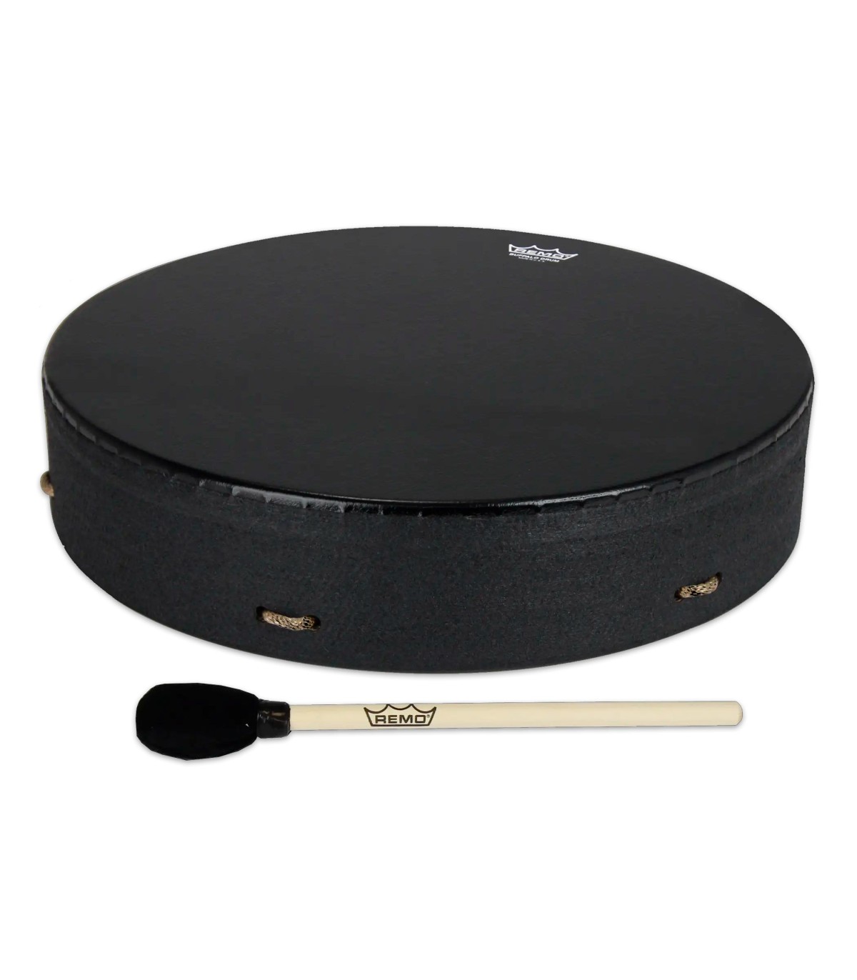 The Remo E1-1316-BE 16" Bahia Buffalo Drum with Black Earth finish is equipped with a rope handle and a Bahia Bass synthetic head, which produces a pure and smooth bass tone when played with the included soft mallet.