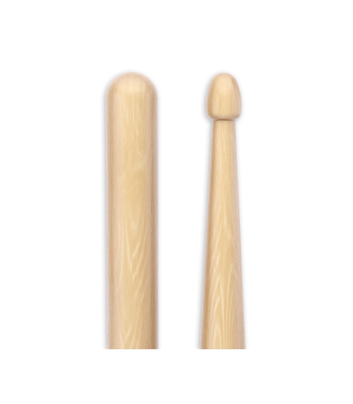The ProMark RBH565AW Hickory Rebound 5A drumstick features a ball-shaped tip and long cone, producing a back-weighted feel ideal for agility.