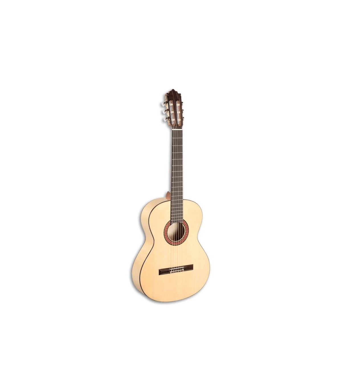 The flamenco guitar Paco Castillo 213 F has a solid fir top, the bottom and the sides on maple. The neck is made from African mahogany. It is a light colored guitar, as is usual with flamenco guitars.
