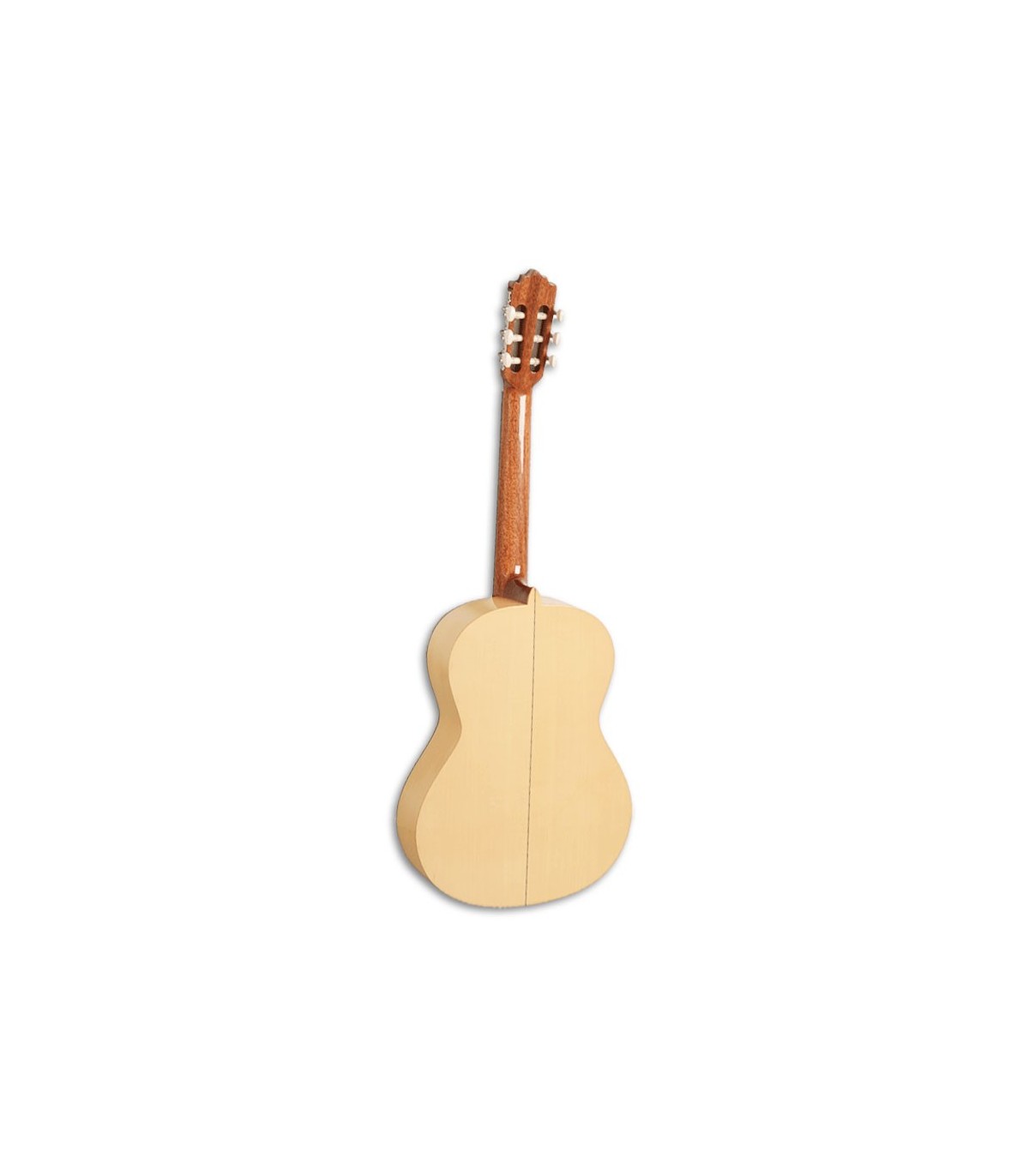 The flamenco guitar Paco Castillo 211 F has a solid spruce top, the back and sides are of sycamore. The neck is made from African mahogany. It is a light colored guitar, as is usual with flamenco guitars.