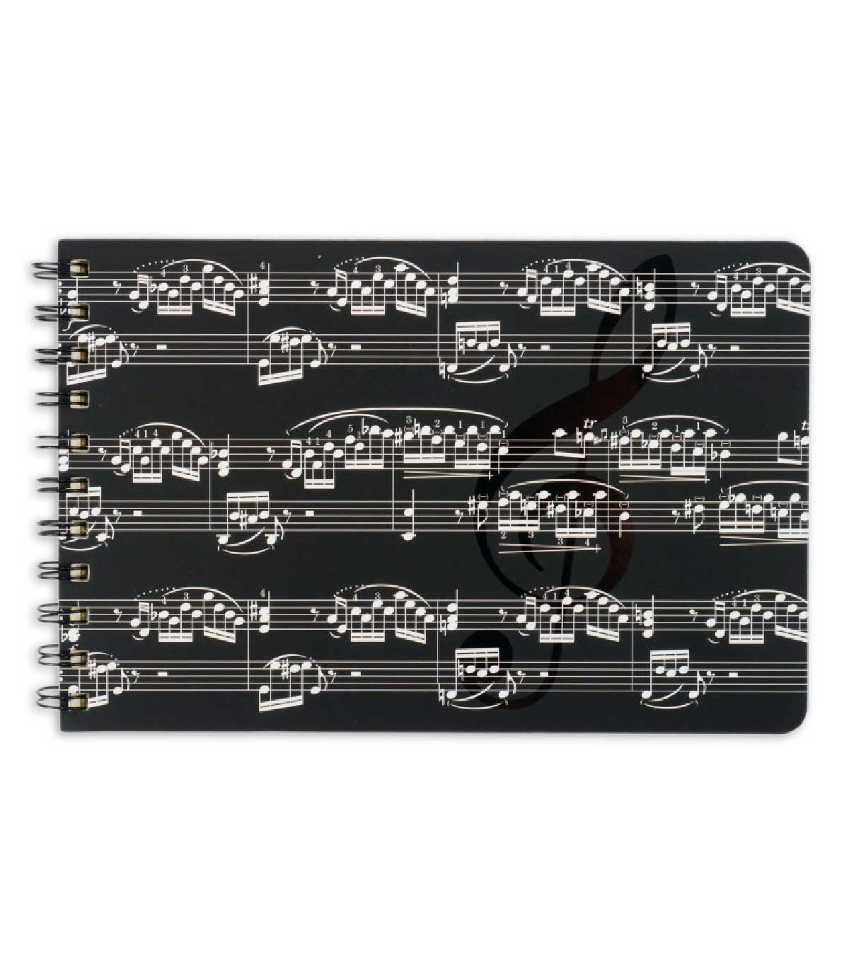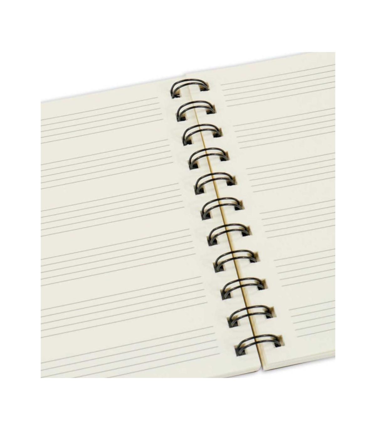This is a notebook containing sheets of blank music score papers. With spiral spine for easy opening and with a more rigid cardboard cover. Each sheet is arranged horizontally and contains 6 pentagram lines.
