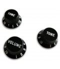 Conjunto de três capas de potenciómetros para guitarras Stratocaster. Uma capa para volume e duas para o controlo do tom. Em plástico preto com texto e números em branco.