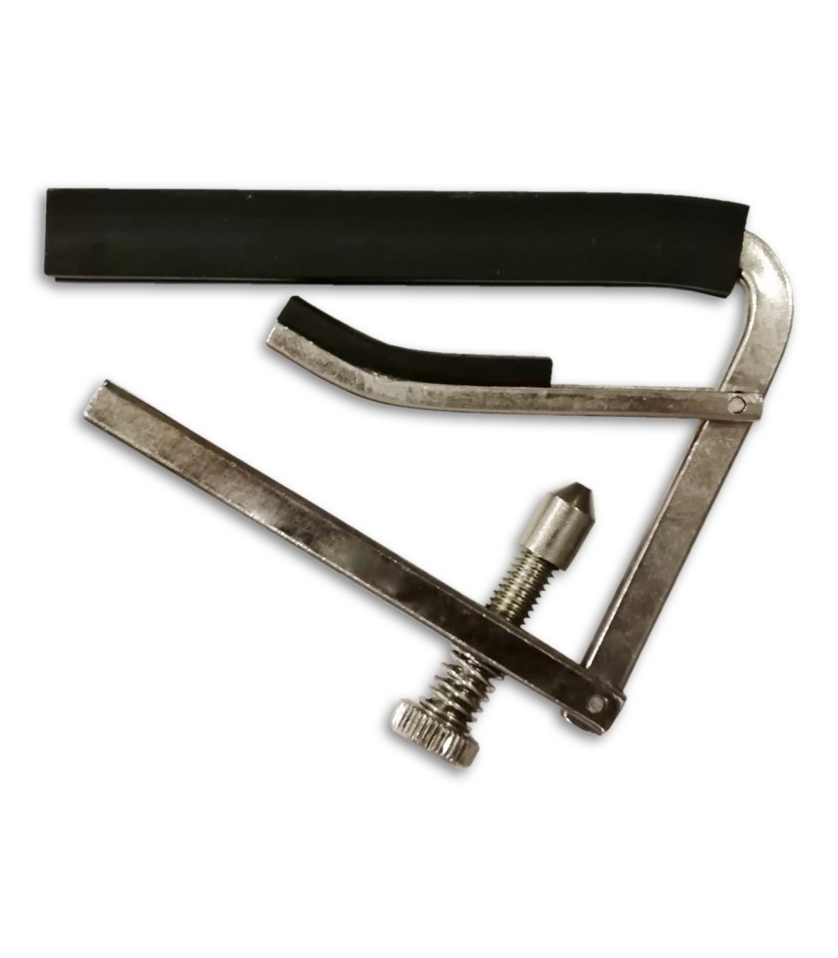 Este transpositor é um acessório de guitarra discreto e útil. Fabricado de aço niquelado, a peça de borracha simula a pressão aplicada por uma barra feita com os dedos.